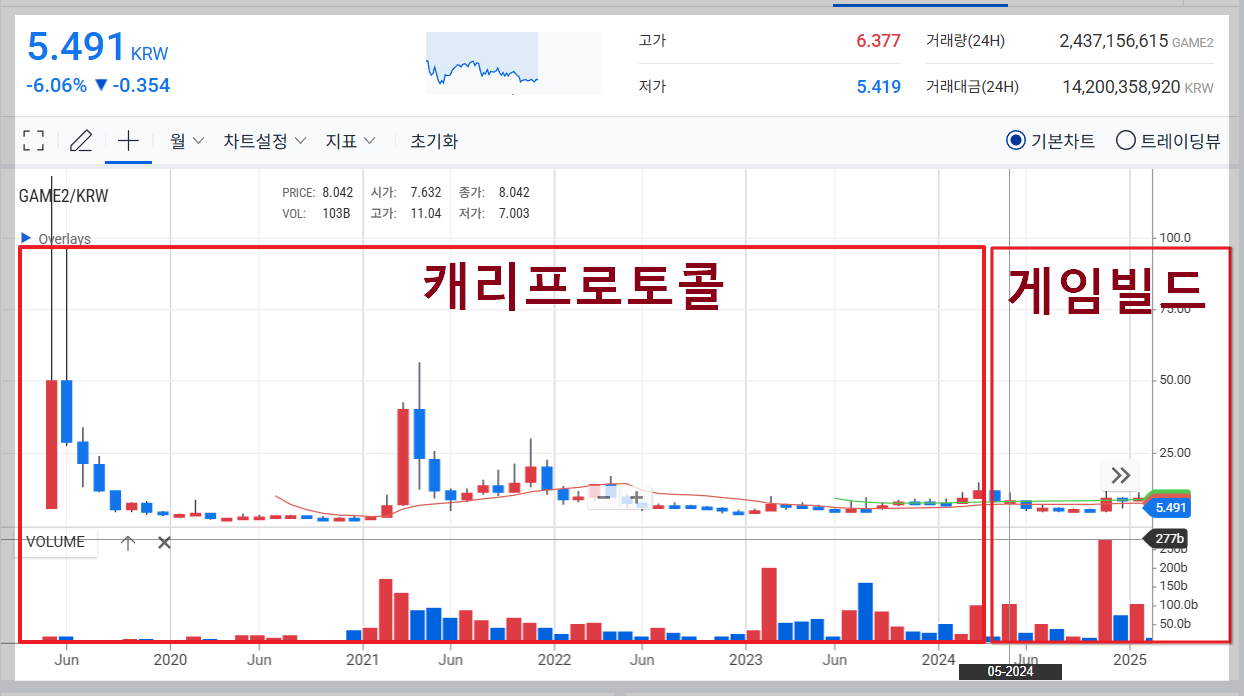 업비트 차트에는 GAME2의 차트가 2019년부터 존재하지만 실제로는 캐리프로토콜(CRE)의 거래 이력이 반영된 것입니다. 2024 5월, 캐리프로토콜과 SLG의 합병으로 새로운 토큰인 게임빌드(GAME2)가 출범했으며 당시 업비트에 상장되있던 기존 캐리프로토콜의 보유자들에게 4회에 걸친 에어드랍 방식으로 GAME 토큰이 분배되었습니다.
