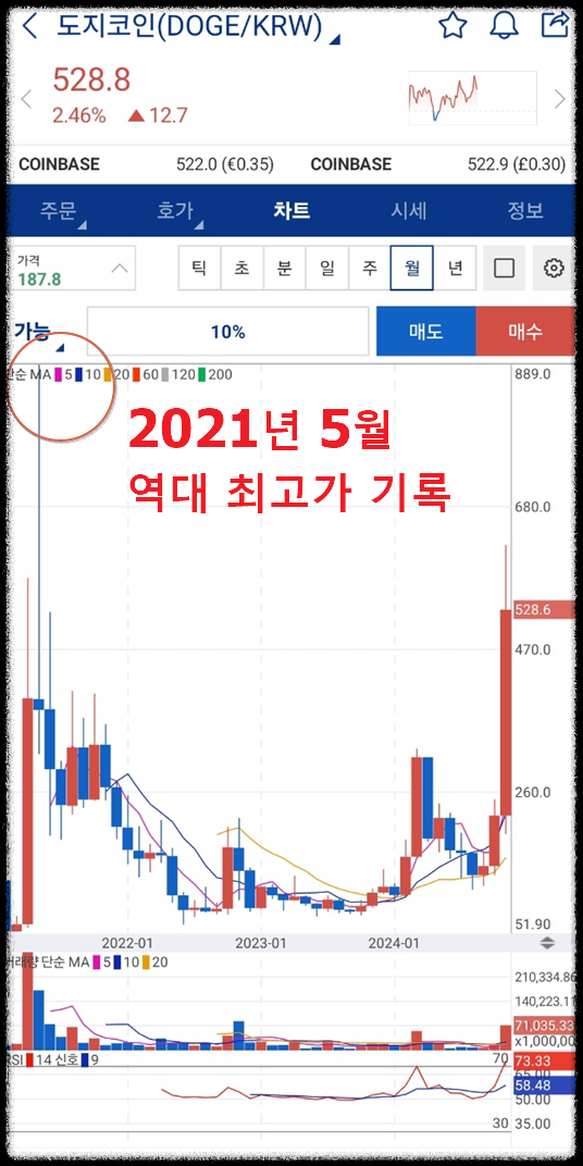 도지코인은 2021년 5월에 최고가를 기록했습니다. 이때 도지코인의 가격은 업비트 기준 889원에 도달하며 많은 투자자들에게 큰 수익을 안겨주었습니다.