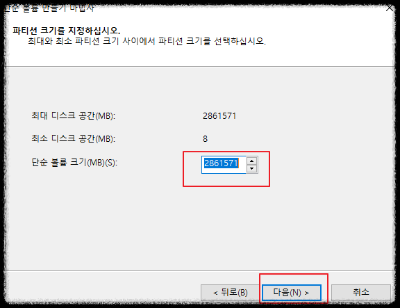 5. 단순 볼륨 만들기 마법사 시작 - 다음