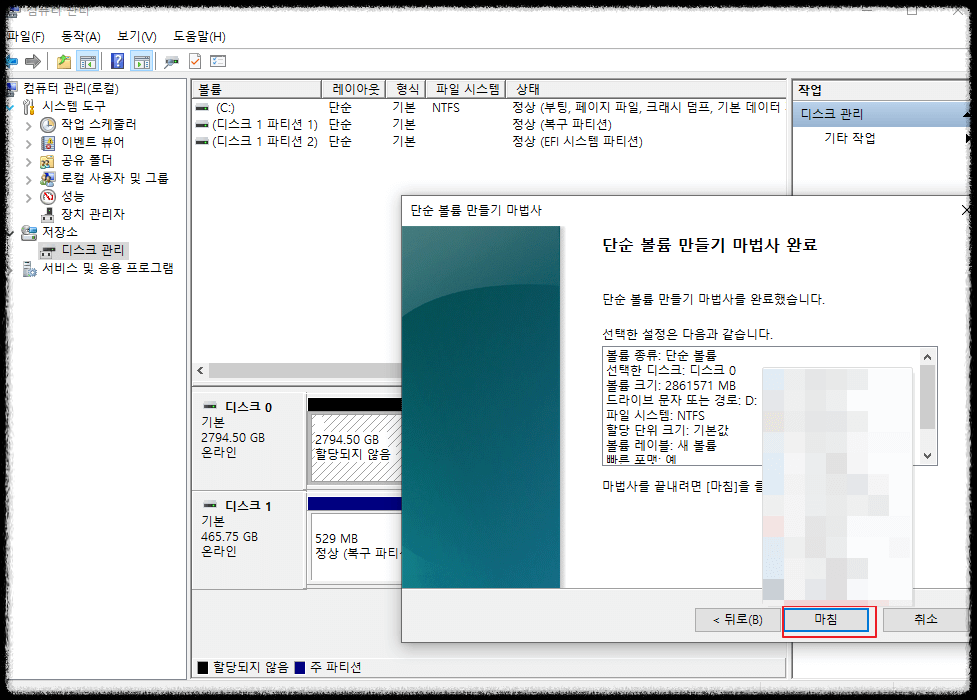 아까까지 할당되지 않음으로 뜨던 디스크 0 영역이 새 볼륨 D드라이브로 잡힌 것을 볼 수 있습니다.