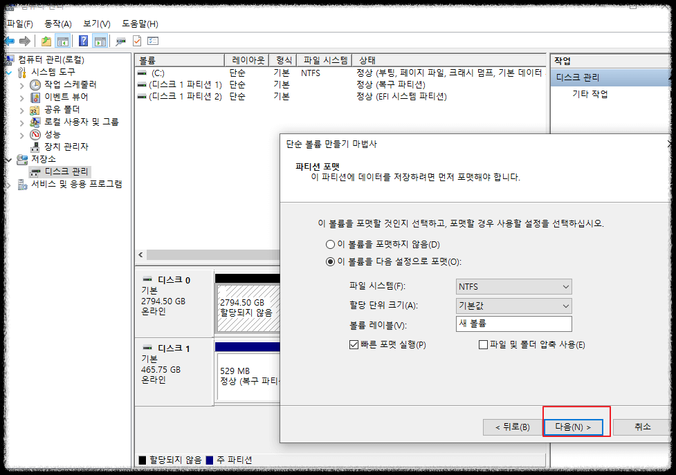 파티션 포맷을 실행하게 됩니다. 다음 클릭