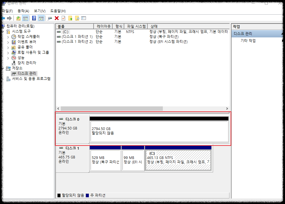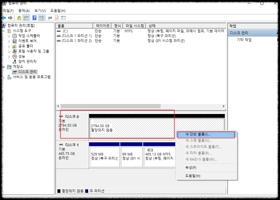 디스크 0이 새로 구입하여 장착한 HDD 3 테라짜리 하드입니다. 할당되지 않음으로 나와있습니다. 지금부터 내 컴퓨터에 인식시키는 작업을 시작해보겠습니다.