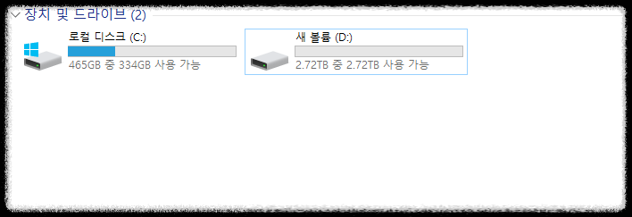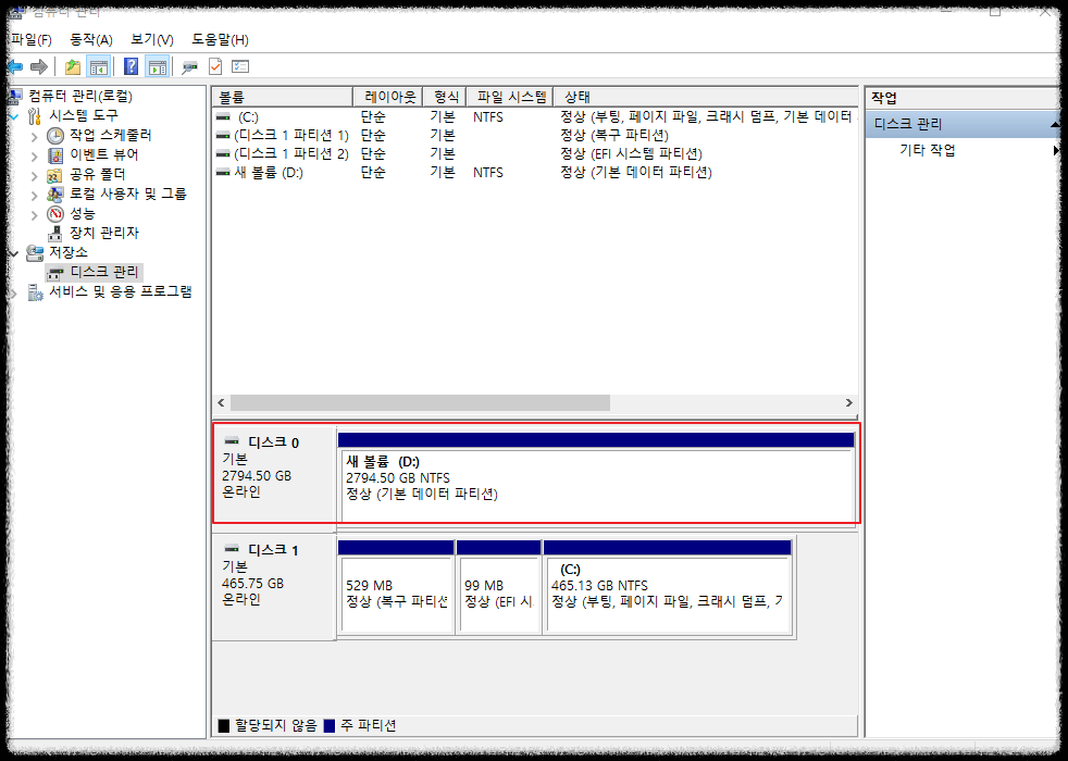 아까까지 할당되지 않음으로 뜨던 디스크 0 영역이 새 볼륨 D드라이브로 잡힌 것을 볼 수 있습니다.