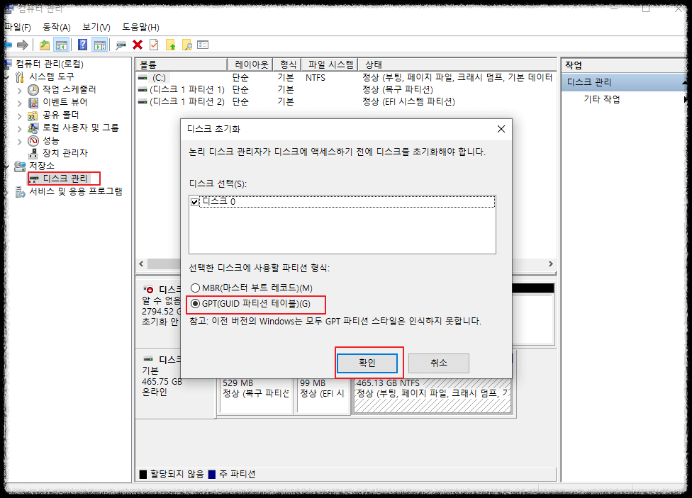 * 윈도우버전과 컴퓨터 성능에 따라서 GPT와 MBR을 인식 못할 수도 있습니다. 만약 초기화를 잘못 진행했다면 아래의 글을 참고하여 다시 초기화하시면 됩니다.