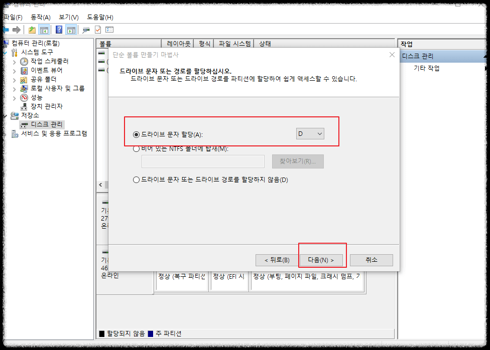 이것도 비어있는 드라이브로 자동으로 표시됩니다. 예전 같았으면 D드라이브는 CD롬 역할을 하는 영역이라 E로 표시되겠지만 요즘에는 CD롬이 사라지는 추세라 D로 할당되었네요. 웬만하면 자동으로 남아있는 드라이브로 표시되니 다음을 클릭합니다.