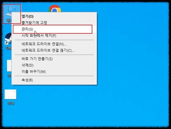바탕화면에 있는 내 pc 에서 마우스 오른쪽 클릭 후 관리 클릭