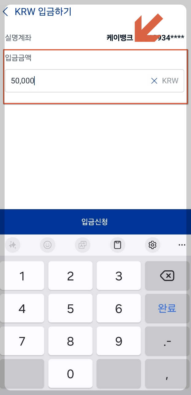 입금전 케이뱅크에 원화가 있어야 됩니다. 예를 들어 100만원을 업비트에 입금하려고 한다면 케이뱅크에도 100만원이 있는 상태여야 합니다.
