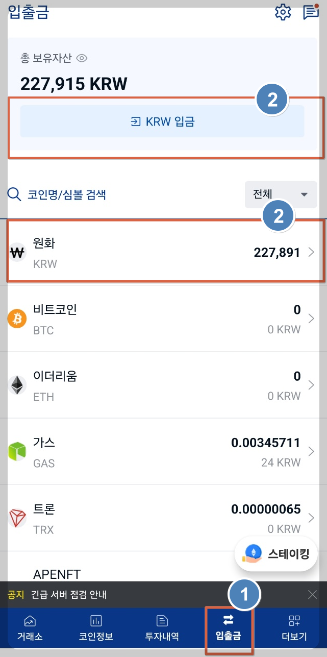 1. 업비트 앱을 실행하고, 하단 메뉴에서 입출금을 선택합니다.