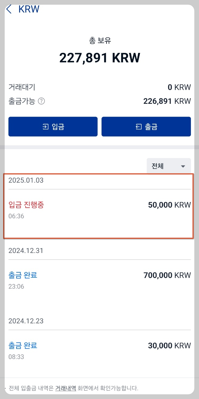 업비트 앱의 입출금 메뉴에서 입금 내역을 확인합니다. 입금 완료까지 다소 시간이 걸릴 수 있으며, 네트워크 상황에 따라 지연될 수 있습니다.