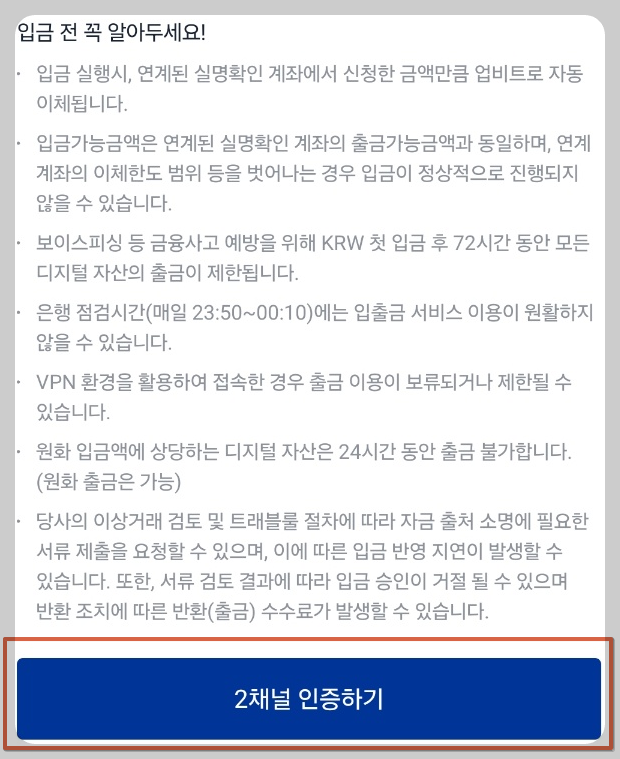 - 24시간 출금 지연제: 최초 원화 입금 후 72시간 이후, 두 번째 원화 입금부터는 입금액에 해당하는 디지털 자산의 출금이 24시간 동안 지연될 수 있습니다.