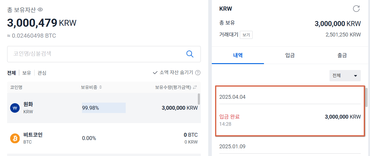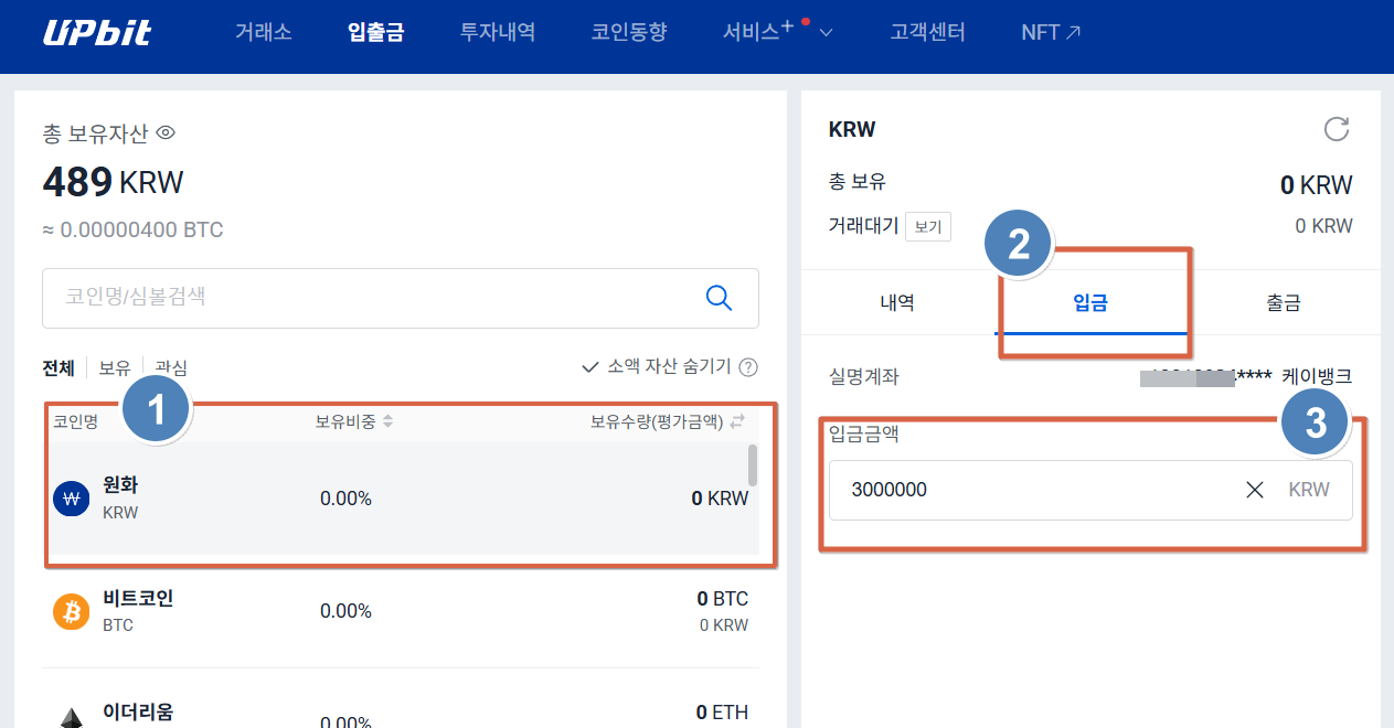 2. 입출금 ➡ 원화 ➡ 입금 ➡ 입금금액 입력
