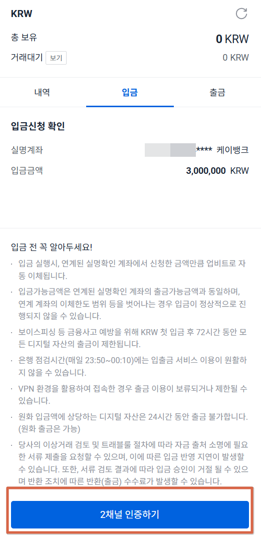 업비트에 원화를 입금하려면 먼저 케이뱅크 계좌에 입금할 금액이 준비되어 있어야 합니다. 예를 들어 내가 300만원을 입금하고 싶다면 케이뱅크에 300만원이 있어야겠죠. 그리고 업비트에 케이뱅크 계좌가 연동이 되어있어야 합니다.