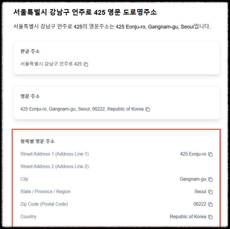 지번 주소(예: 서울시 강남구 역삼동)보다 도로명 주소(예: 서울특별시 강남구 테헤란로 123)로 변환해야 영어 주소가 더 정확하게 변환됩니다.
