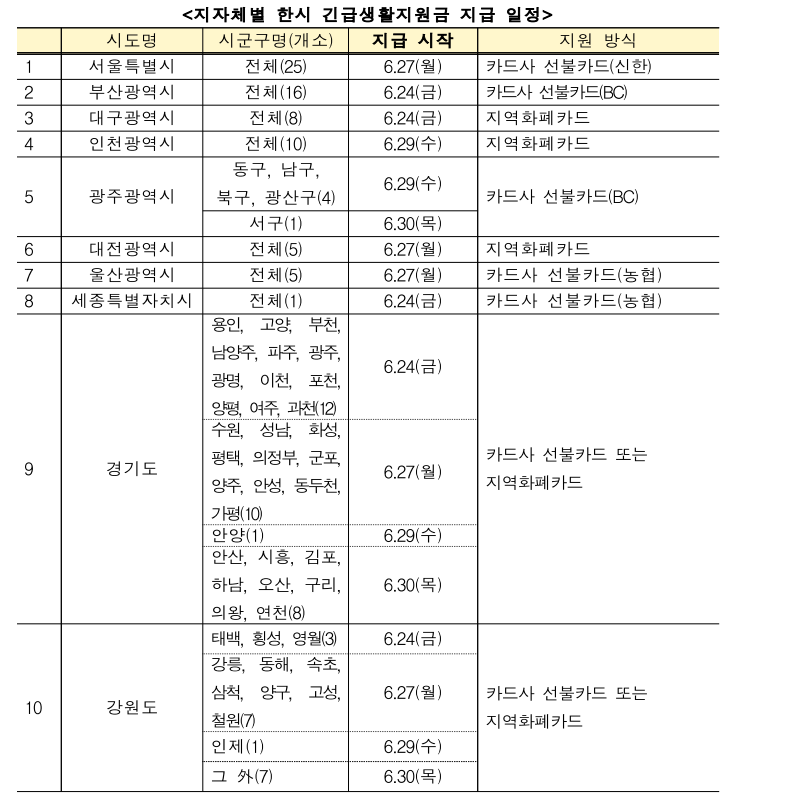 이번 한시적 저소득층을 대상으로한 긴급생활지원금은 6월24일부터 6월30일까지 지역마다 다르게 일정이 잡혀있습니다. 자신이 속한 지역의 지급일정을 확인해 보시기 바랍니다.