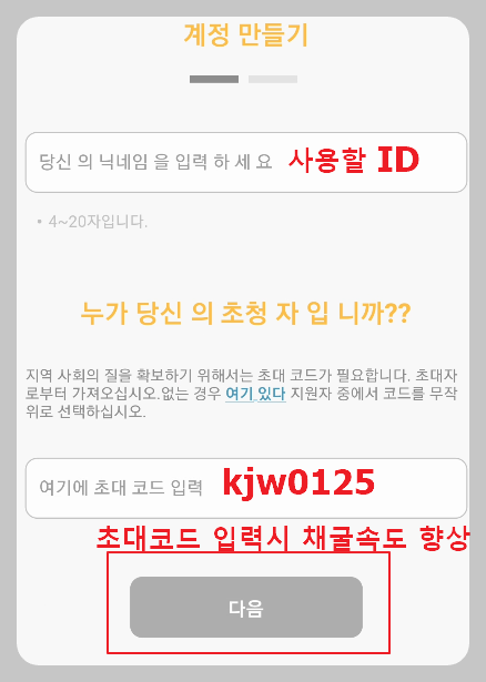✅ 사용할 ID, 초대코드 입력 : kjw0125
