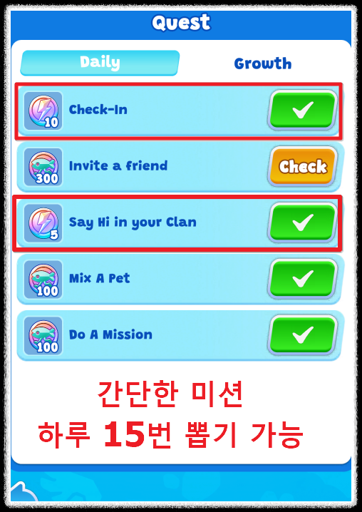 데일리 미션인 출석체크, 클랜에 인사정도만 진행해도 매일 최소 15번의 뽑기를 할수 있습니다. 매일 15마리 이상의 캐릭을 얻을수 있다는 뜻입니다.