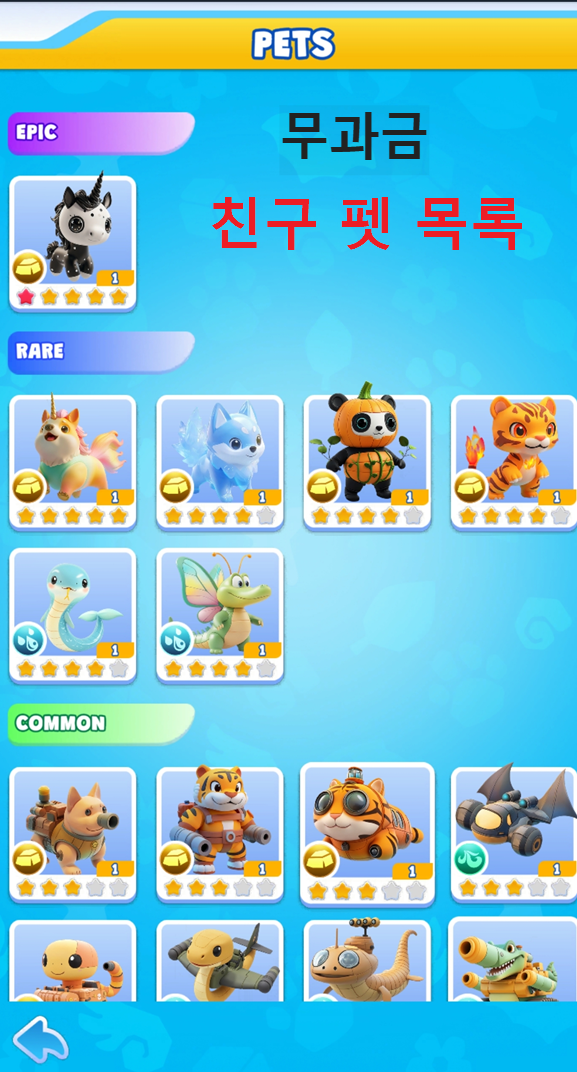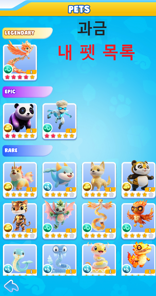 펫등급은 COMMON < RARE < EPIC < LEGENDARY < MYTHICAL 로 구성되어 있습니다. 왼쪽 COMMON 등급이 제일 낮은 등급이고 제일 얻기 쉬운 펫 입니다. MYTHICAL 등급이 가장 얻기 어려운 등급 입니다.