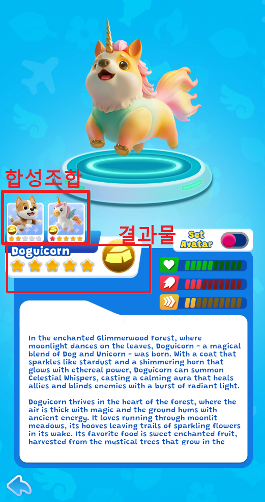 초반에 준 6성 유니콘을 기본 2성짜리 강아지랑 멋모르고 합성시켰더니 5성 뿔달린말강아지가 탄생하였습니다.