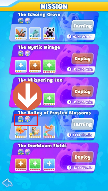 속성에 맞게 해당등급의 펫을 배치시켜주면 미션을 시작할수 있습니다. 더 높은등급의 펫은 낮은등급의 미션에 참여할수 있지만 낮은 등급의 펫은 더 높은등급의 미션에 참여 할수 없습니다.