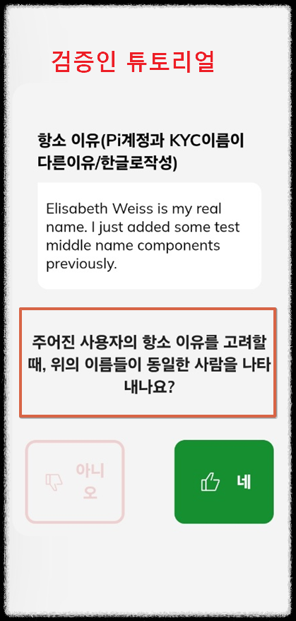 파이코인 검증인 튜토리얼 화면을 보면 "닉네임, 이니셜, 중간이름 추가/제거 등과 작은 변경은 예가 적절합니다." 라고 안내하고 있는데 이말도 사실 애매모호 합니다. 위에서 부터 보면 영어이름, 모국어 이름, KYC 이름인거 같습니다.