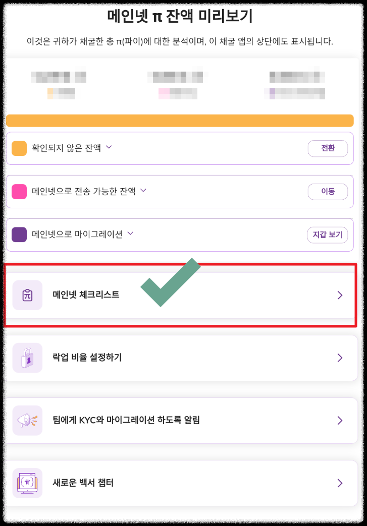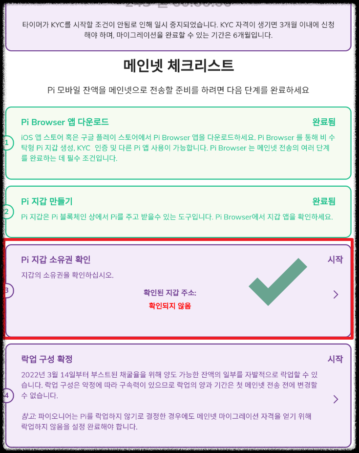 ✅ 메뉴 - mainnet - 메인넷 체크리스트 - pi 지갑 소유권 확인 클릭