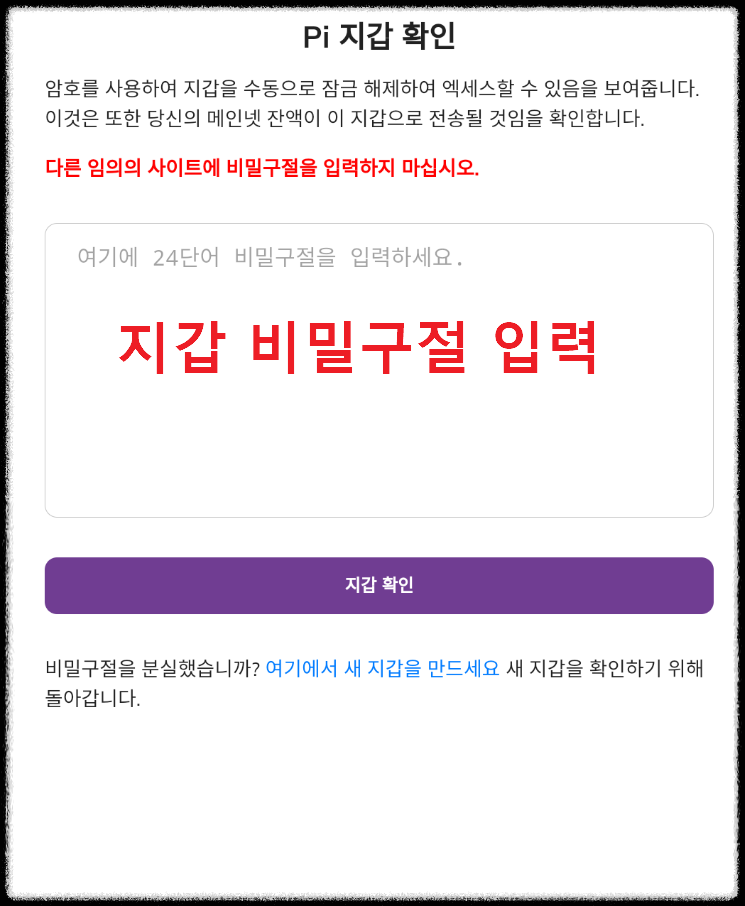 ✅ 일전에 만들었던 파이 지갑 비밀구절 단어 24개를 입력합니다.