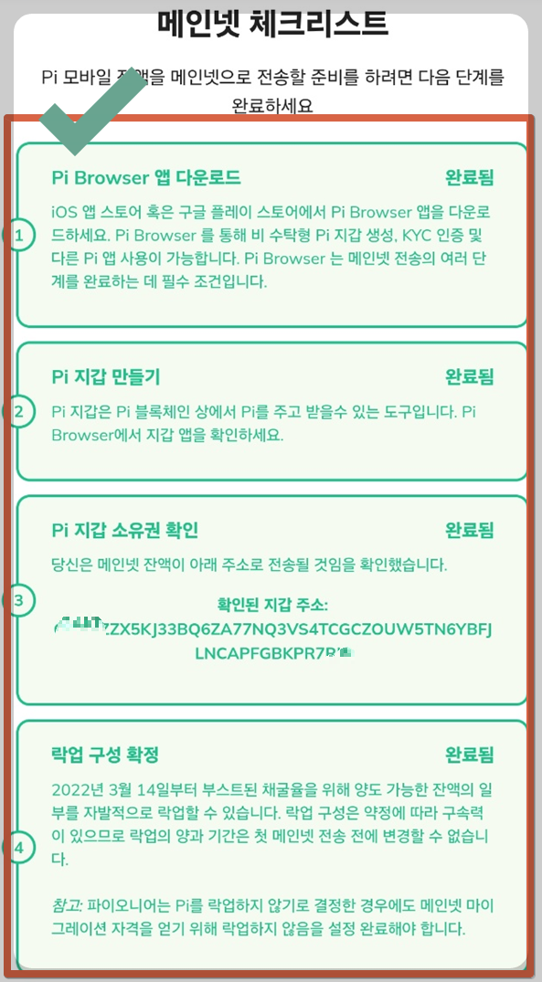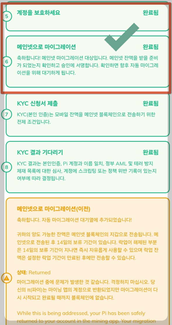메인넷은 테스트 환경이 아닌 실제 블록체인 상에서 파이코인을 이동시키고 거래할 수 있는 공식 네트워크입니다. 메인넷 이전을 완료해야만 채굴한 파이코인을 실제로 받을수 있는 준비가 완료 됩니다. 최종 단계인 KYC 신청은 한달이후에 할수 있으니 그전에 할수있는 메인넷 체크리스트를 차근차근 해주도록 합니다.