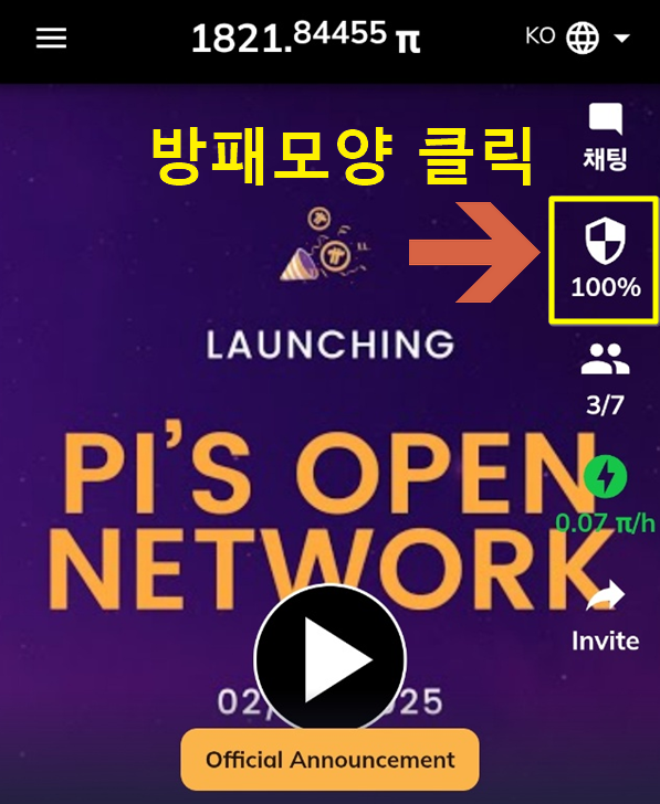파이코인 가입후 4일째부터 방패설정을 할 수 있습니다. 채굴속도를 올릴수 있는 작업이라 반드시 필수로 해줘야하는 작업입니다. 최대 100% 채굴속도를 올릴수 있으며 하고 안하고의 차이가 나중에 모이는 파이코인 물량에서 엄청난 차이가 나게 됩니다.