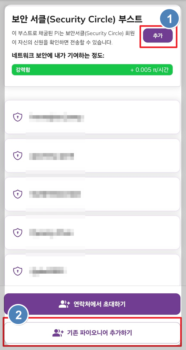 사진속 1번 항목의 보안서클 부스트 메뉴는 나를 초대한 초대인 및 내가 초대한 인원들이 목록에 뜨게 됩니다.