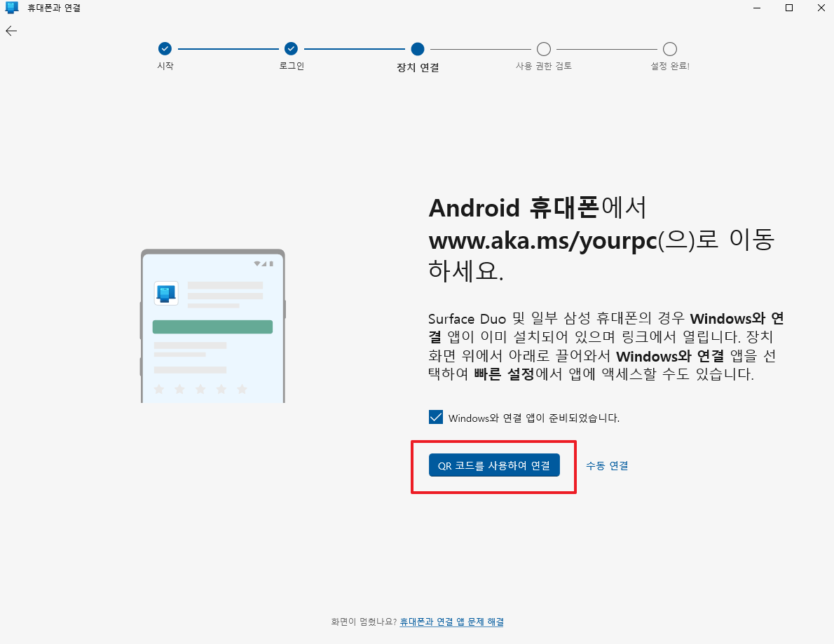 윈도우와 연결 앱이 준비되어습니다를 체크하고 아래 연결버튼을 클릭합니다.
