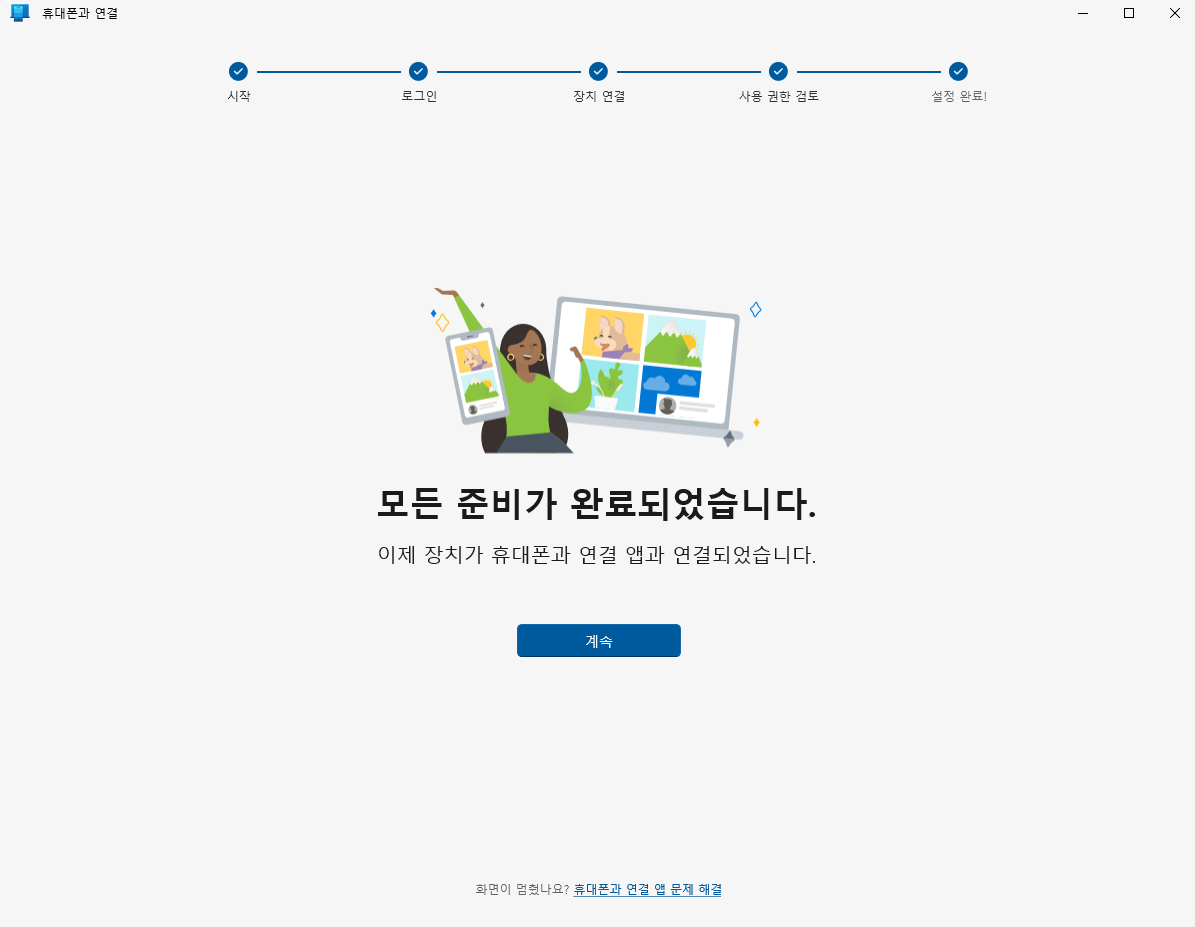 윈도우와 연결 앱이 준비되어습니다를 체크하고 아래 연결버튼을 클릭합니다.