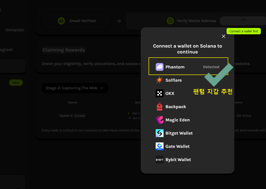 이전 에어 드랍때 개인 코인 지갑을 연결해 두지 않아 채굴을 오래 하고도 아직도 보상으로 코인을 못받은 분들이 종종 있는거 같습니다. 시간여유가 있을때 미리 지갑을 연결해 놓는걸 추천 드립니다. 솔라나 계열 코인이기 때문에 솔라나 기반 개인지갑을 연결해야 합니다.