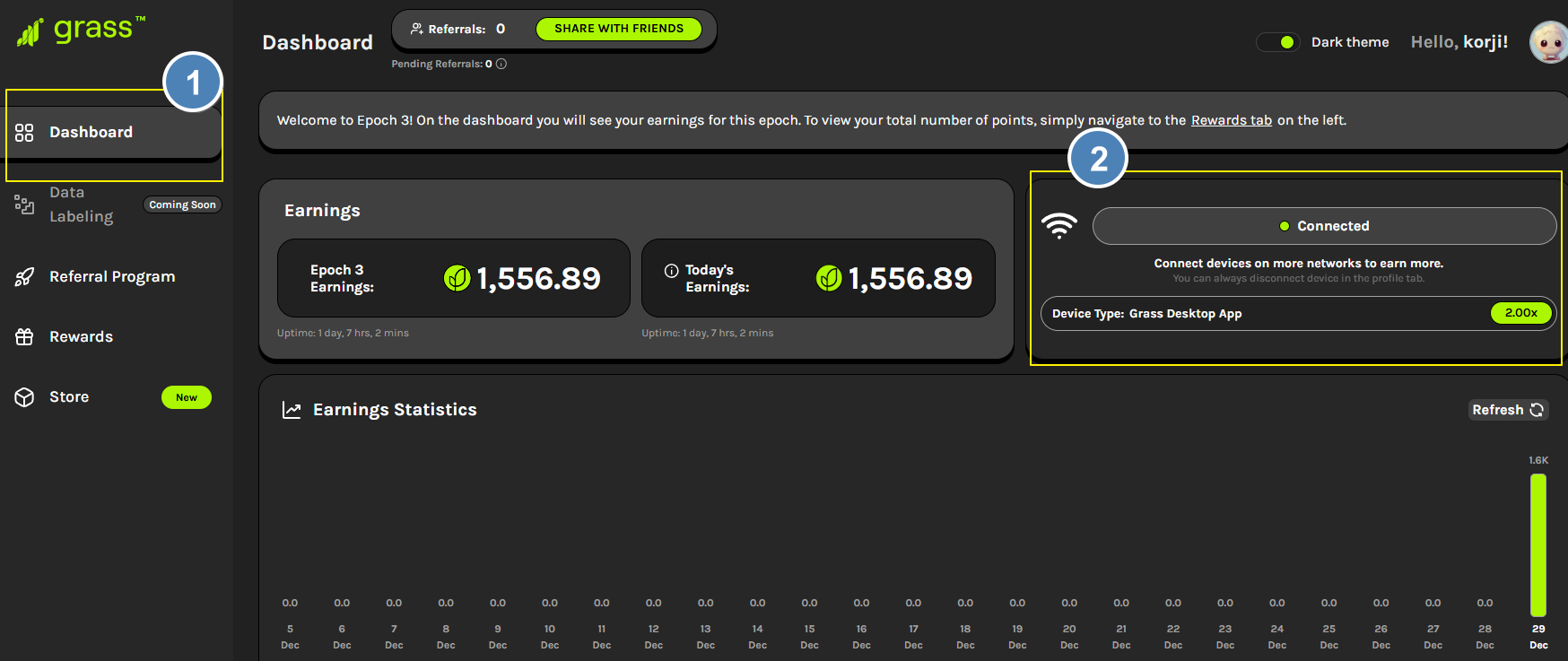 웹페이지로 돌아와 대시보드 탭에서 얻은 포인트를 볼수 있습니다.